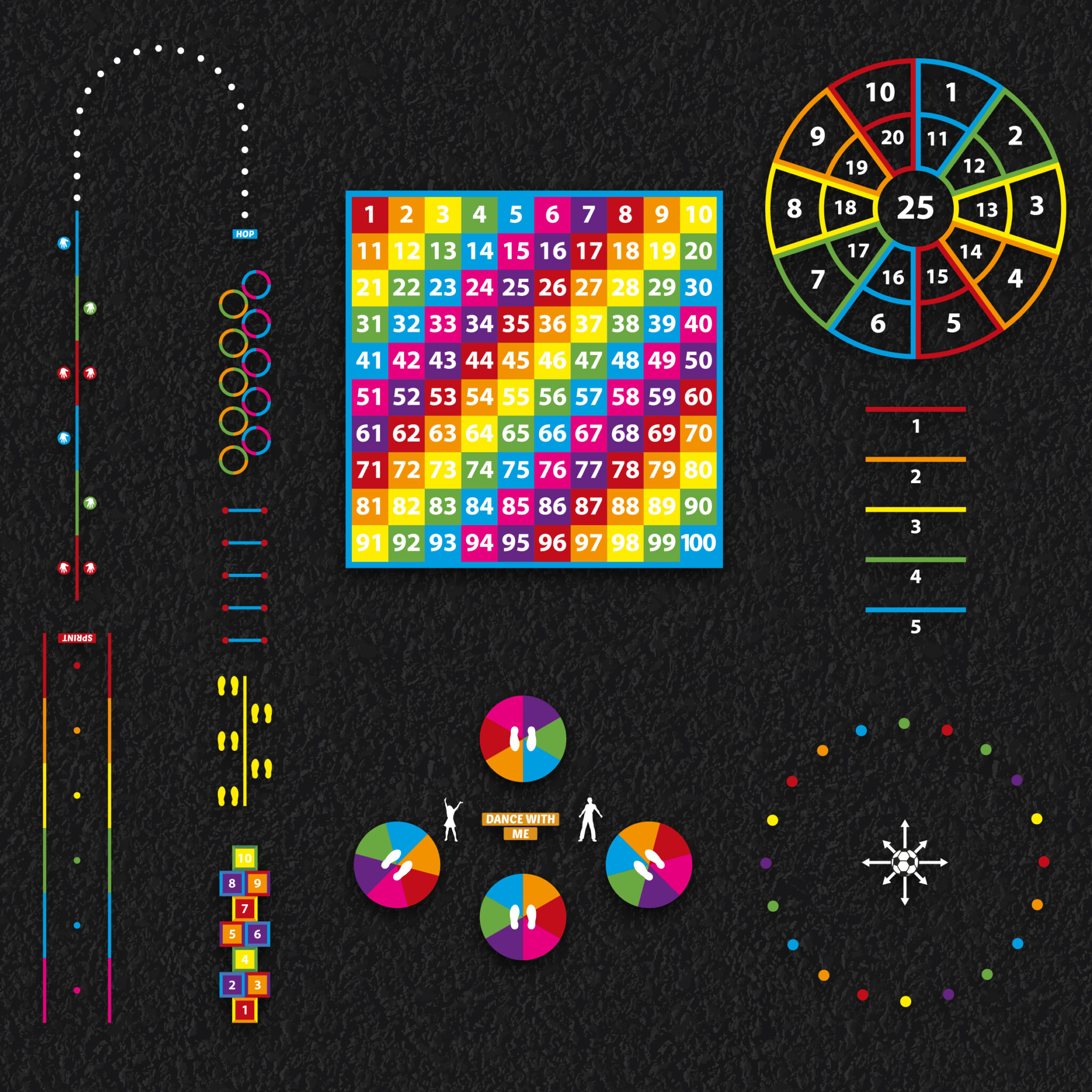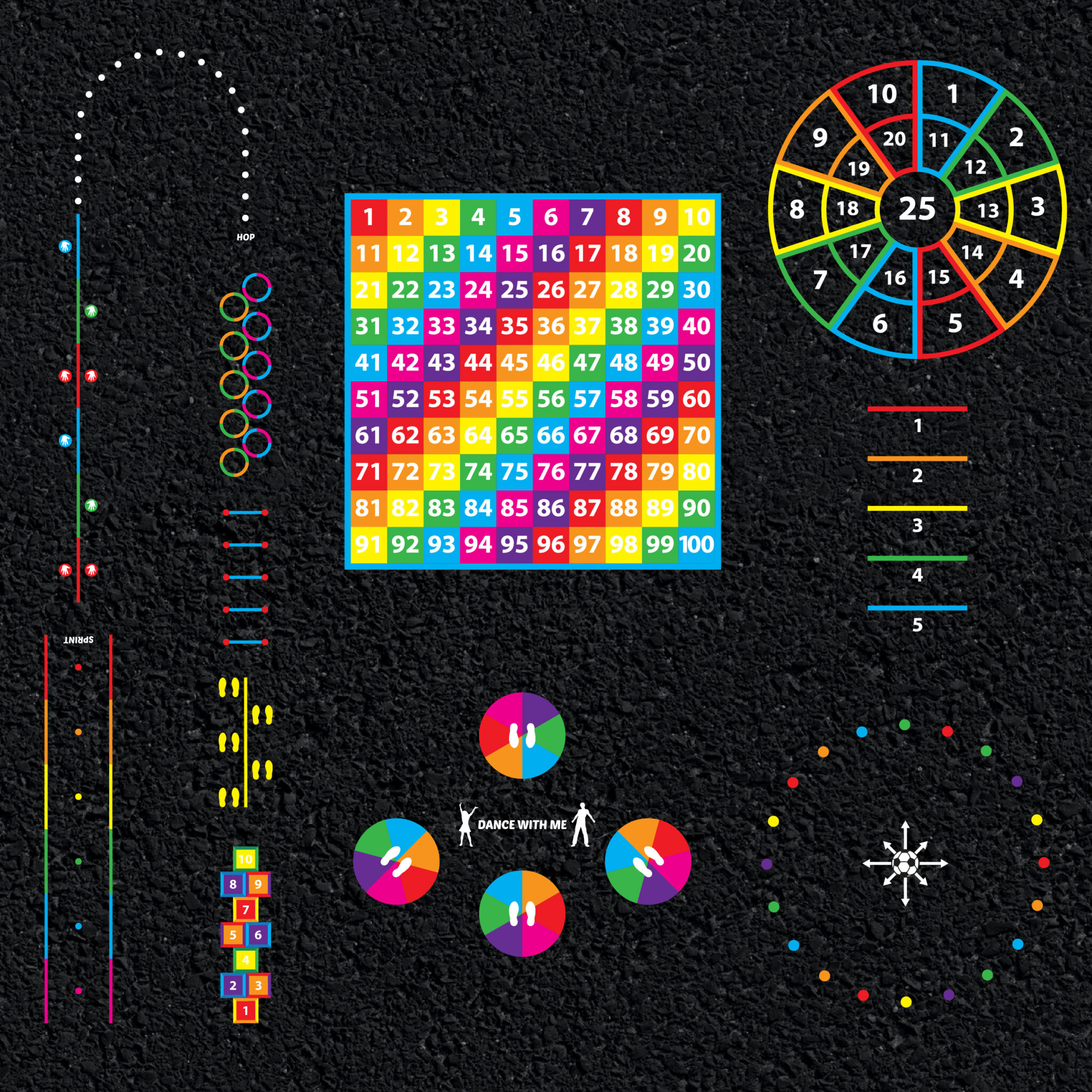 This package is a perfect selection of our most popular preformed thermoplastic playground markings, which can encourage and motivate children to develop their skills outside of the classroom.